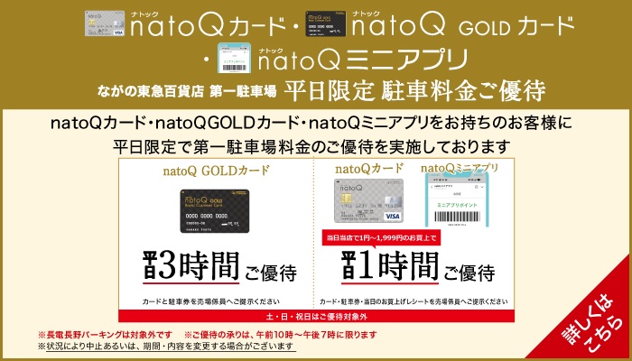 natoQ、natoQ GOLD、natoQミニアプリ会員様限定 平日限定 駐車料金ご優待