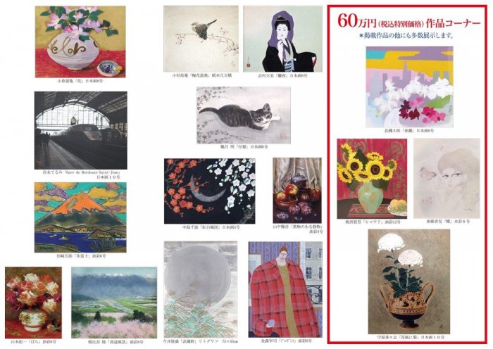 催物情報一覧に戻る 駅前開店60周年特別企画 『新春絵画市』 同時開催『60万円作品展示コーナー』 開催期間 12月28日(日)~2026年1月7日(水) ※最終日は午後3時閉場 開催場所 別館シェルシェ4階 美術サロン ※入場無料 新年を迎えるにふさわしい、巨匠作家・人気作家など厳選作品を展覧いたします。 また駅前開店60周年特別企画・招福特別価格60万円作品展示コーナーもご用意いたします。 どうぞこの機会にご高覧くださいませ。 催物情報一覧に戻る