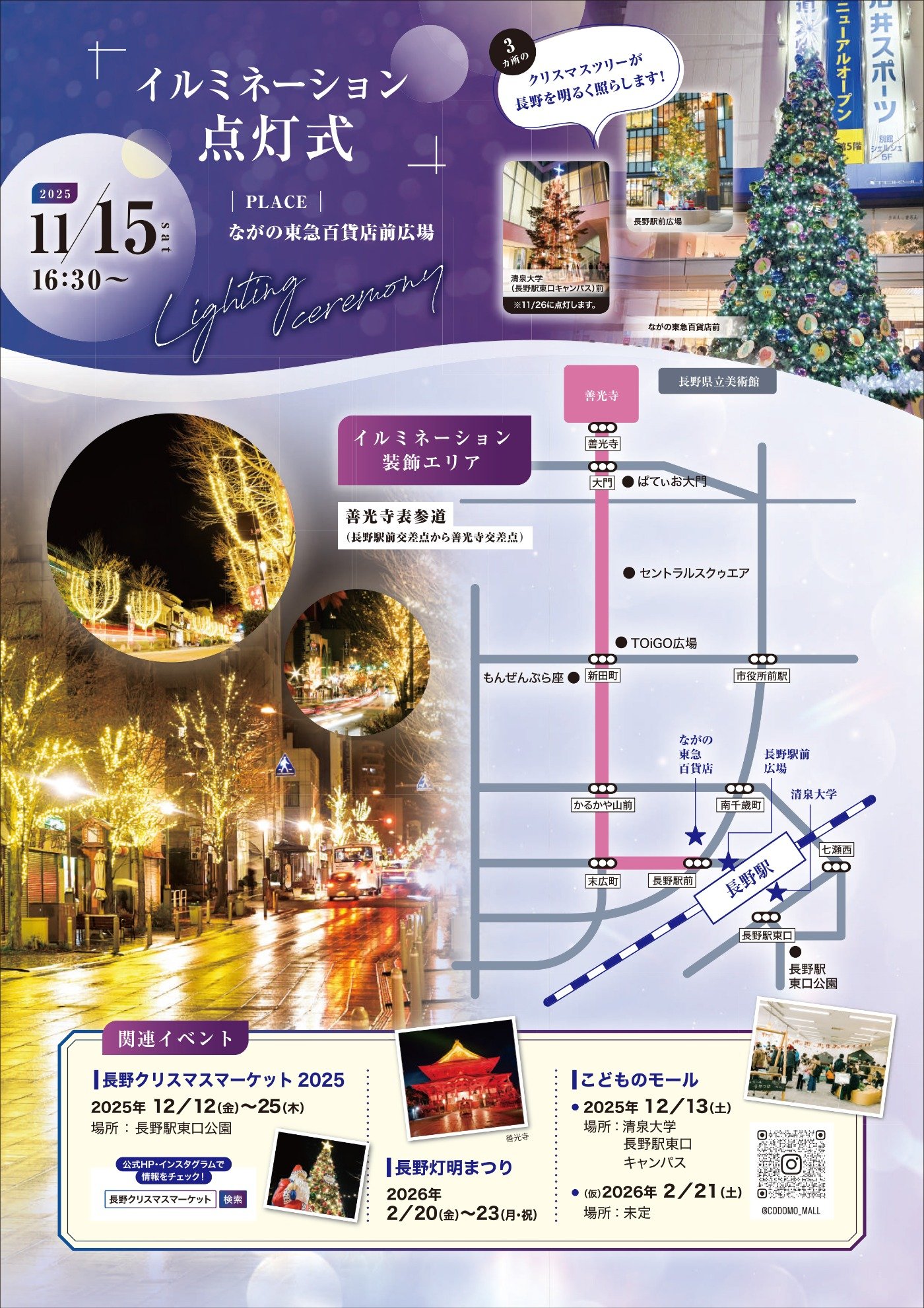 催物情報一覧に戻る クリスマスツリー点灯式 開催期間 11月15日(土) 【セレモニー】16:45頃 開催場所 本館正面広場 【クリスマスツリー点灯式】 11月15日(土) 16:45~【セレモニー】 ◆本館正面広場 ・オープニングイベント 『長野市出身のシンガーソングライターのななせさん』 『清泉女学院大学の学生さんによるハンドベルコンサート』 ・クリスマスツリー点灯(17:00頃) 催物情報一覧に戻る