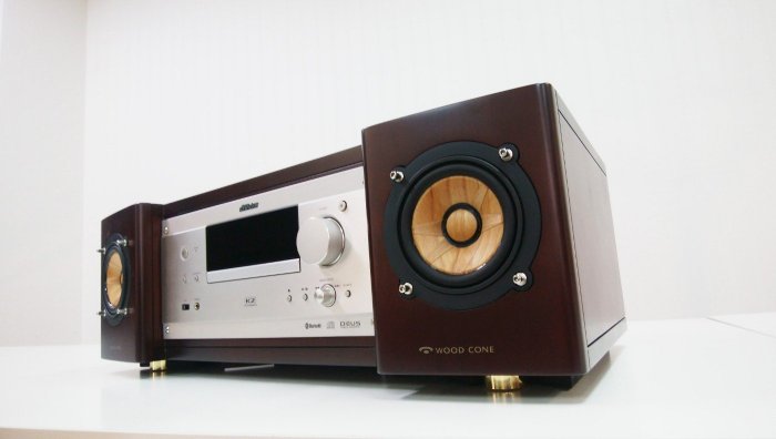 最大の特徴でもあるウッドコーンスピーカー。コンパクトな一体型でもワイドな音場を再現できる