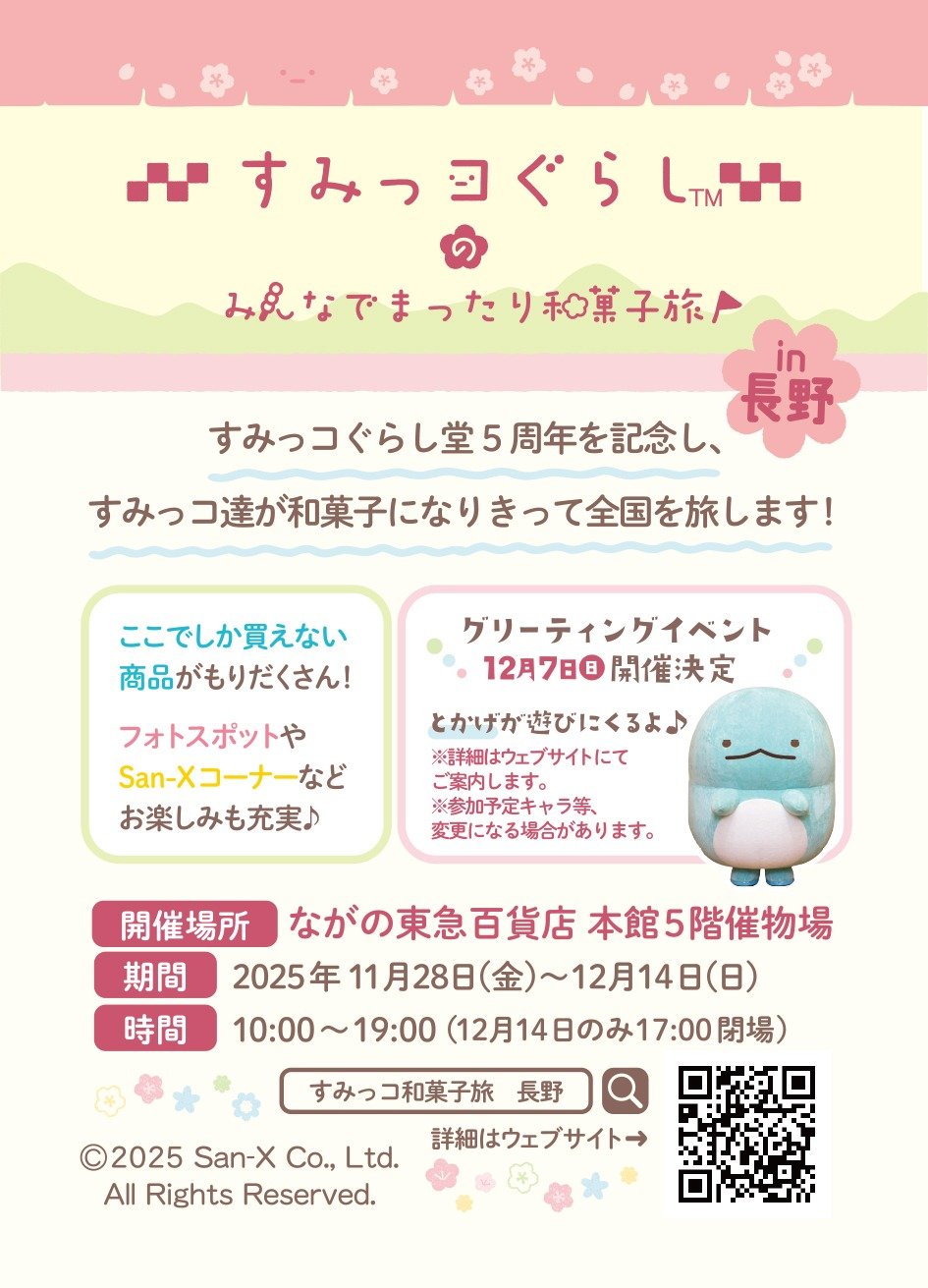 催物情報一覧に戻る すみっコぐらしのみんなでまったり和菓子旅 開催期間 11月28日(金)~12月14日(日) ※最終日は午後5時閉場 開催場所 本館5階 催物場 すみっコぐらしが全国6都市を旅するイベントが開催決定! もちもちのいちごだいふくやぷるぷるのまっちゃぷりんなどおいしい和菓子になりきったすみっコたち。 ぬいぐるみをかわいく撮れちゃうぬい撮りスポットや、 すみっコたちといっしょに和菓子やさんごっこが楽しめるフォトスポットも! 「すみっコぐらしのみんなでまったり和菓子旅」特設サイトはこちら ▽ 催物情報一覧に戻る