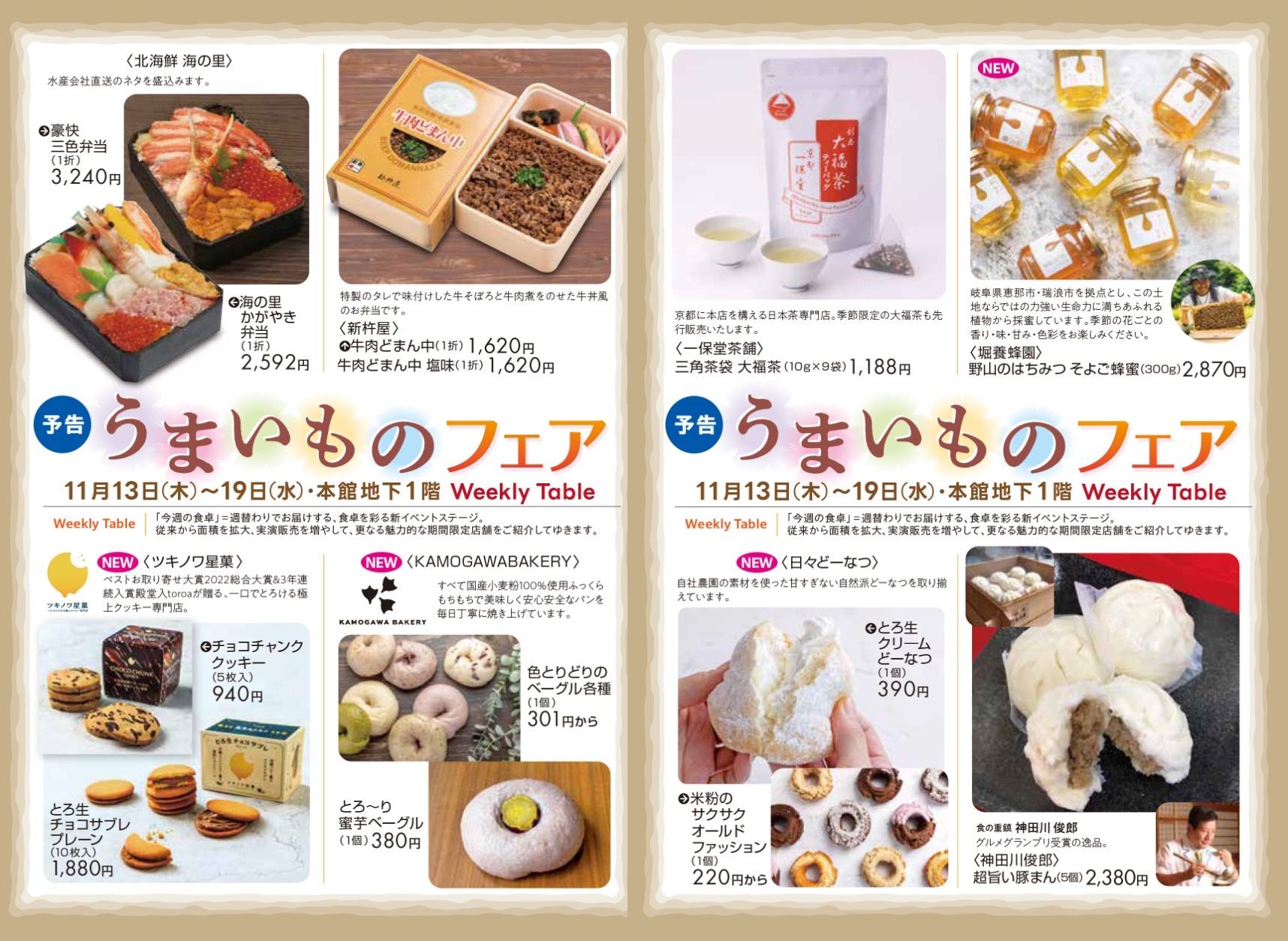 人気の海鮮弁当や〈新杵屋〉の牛肉どまん中をはじめ、ながの東急百貨店に初登場の自社農園の素材を使った甘すぎない自然派どーなつを販売している〈日々どーなつ〉、一口でとろける極上クッキー専門店〈ツキノワ星菓〉、国産小麦粉100%使用のふっくらもちもち食感のベーグル〈KAMOGAWABAKERY〉、季節の花ごとの香り・味・甘み・色彩を楽しめる〈堀養蜂園〉のはちみつなどを販売いたします。