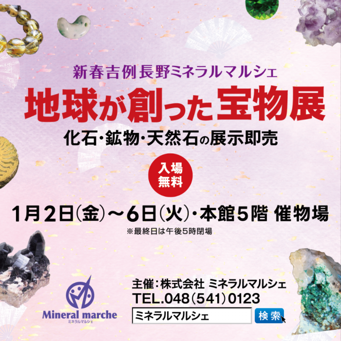 催物情報一覧に戻る 長野ミネラルマルシェ~地球が創った宝物展~ 開催期間 1月2日(金)~6日(火) ※最終日は午後5時閉場 開催場所 本館5階 催物場 新春吉例!長野ミネラルマルシェ 催物情報一覧に戻る