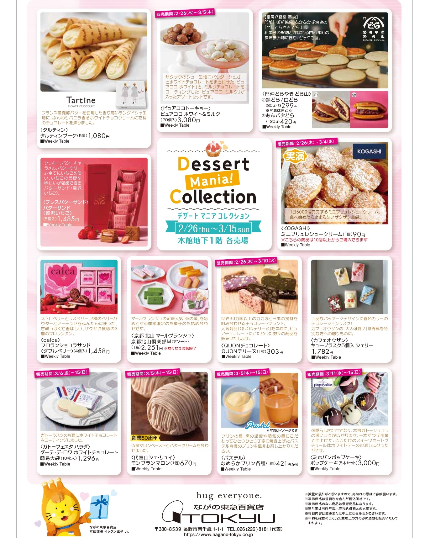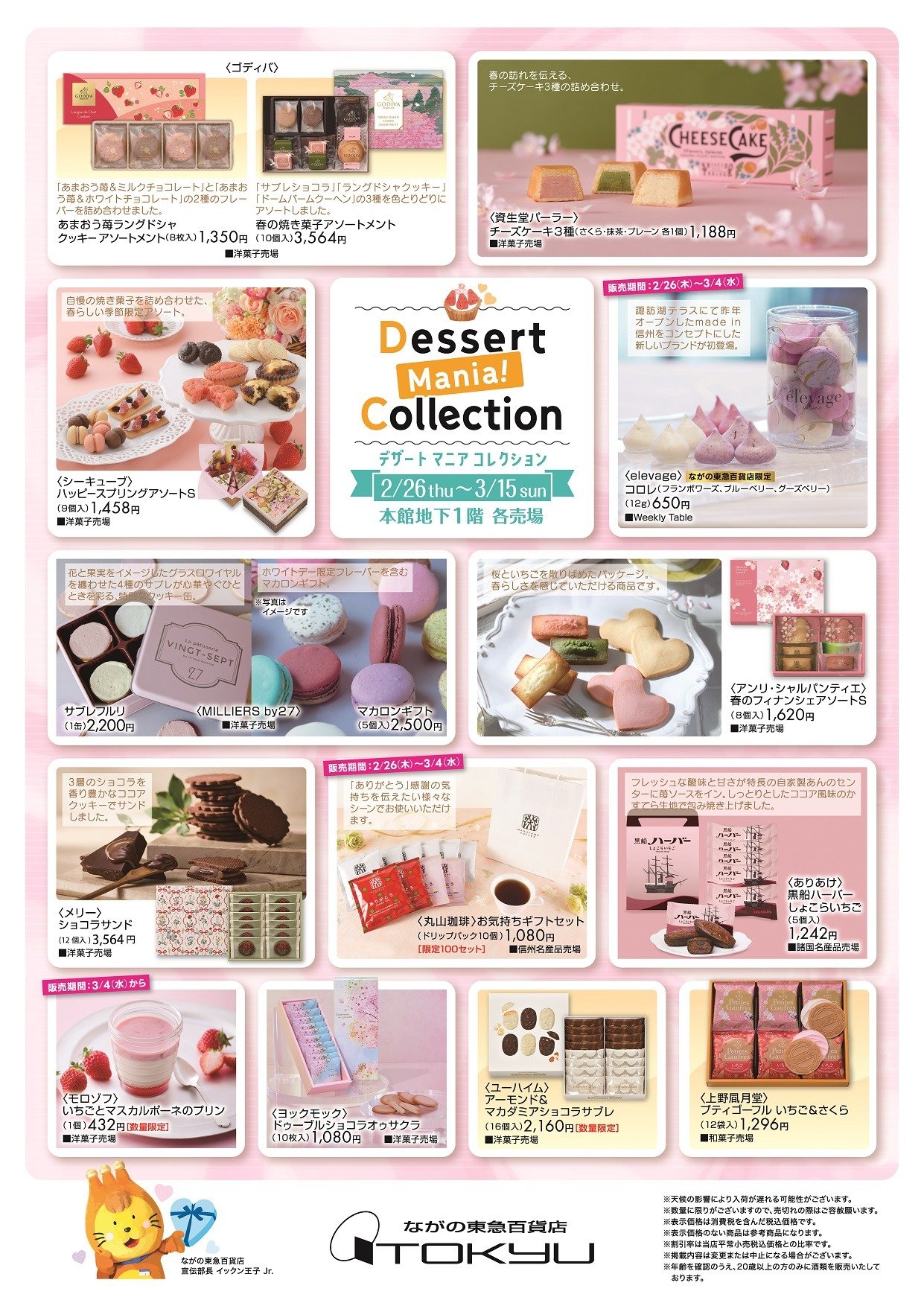催物情報一覧に戻る 『Dessert Mania! Collection』 デザートマニアコレクション 開催期間 2月26日(木)~3月15日(日) 開催場所 本館地下1階 Weekly Table、各売場 スイーツ好きにたまらない!人気のスイーツフェア タルティン 門仲どらやき どら山 caica ガトーフェスタ ハラダ ※3/6(金)から PLESS BUTTER SAND QUON CHOCOLATE(久遠チョコレート) ※3/10(火)まで 代官山シェ・リュイ ※3/5(木)から ミホパンポップケーキ ※3/11(水)から パステル ※3/5(木)から CAFE OHZAN(カフェオウザン) ピュアココトーキョー ※3/5(金)まで 京都 北山 マールブランシュ 「数量限定」 KOGASHI ※3/4(水)まで 催物情報一覧に戻る