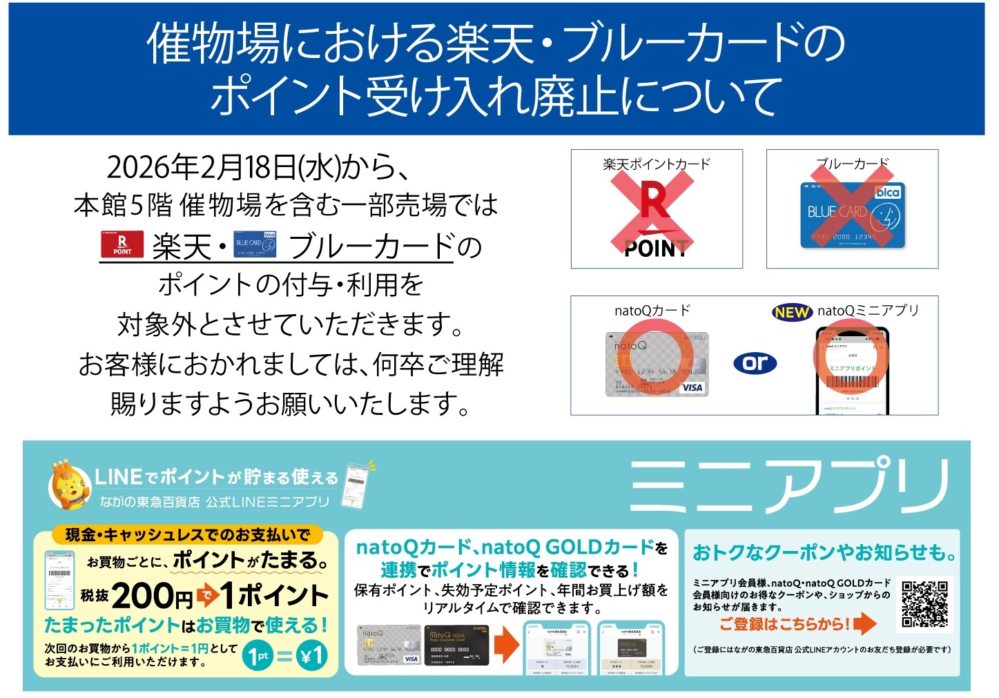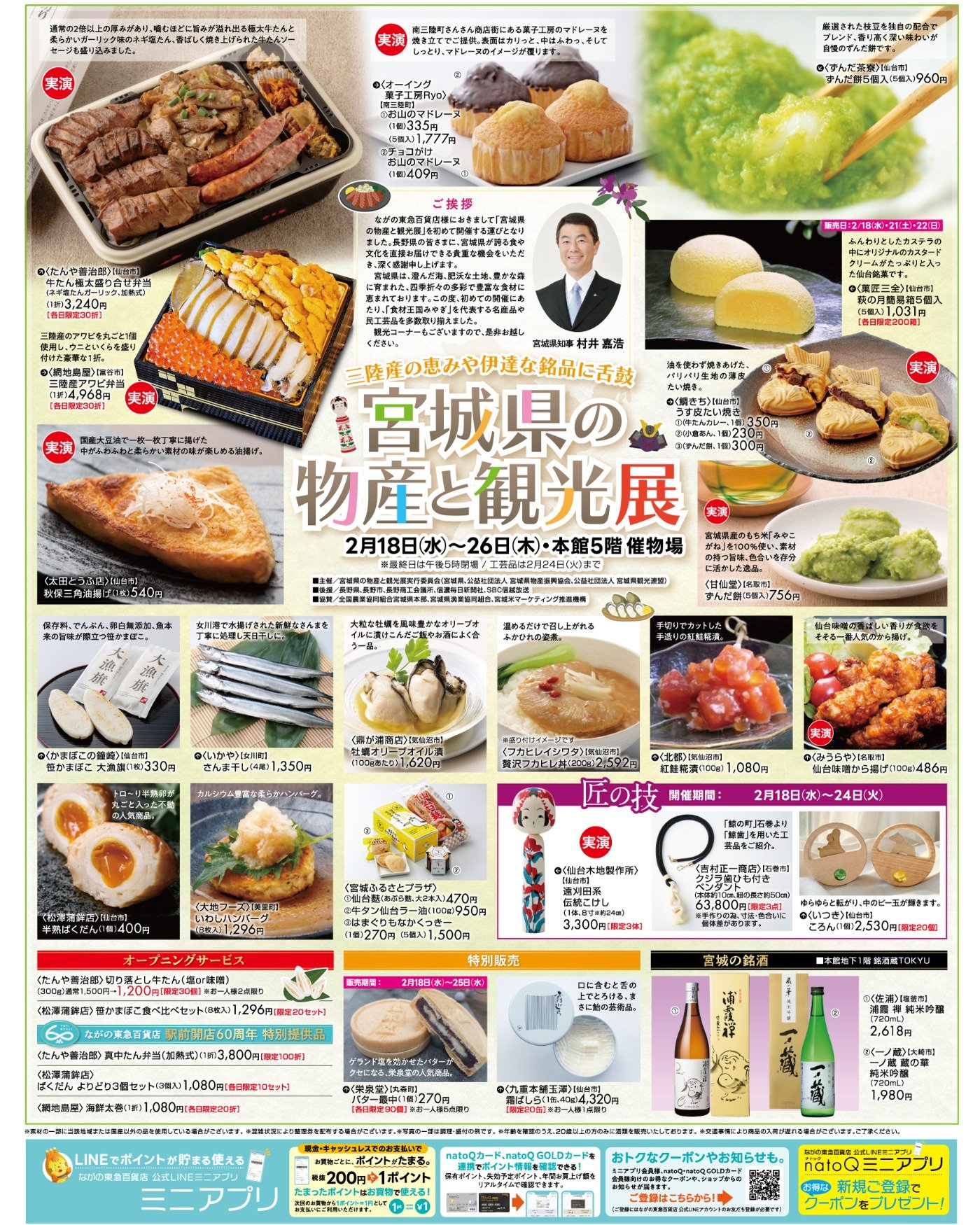 催物情報一覧に戻る 宮城県の物産と観光展 開催期間 2月18日(水)~26日(木) ※工芸品は2月24日(火)まで 開催時間 ※最終日は午後5時まで 開催場所 本館5階 催物場 本館5階 催物場を含む一部売場での楽天・ブルーカードのポイント対象外のお知らせ natoQミニアプリ登録はこちらから ※ご登録にはながの東急百貨店公式LINEアカウントの友だち登録が必要となります。 Q&Aはこちらから 催物情報一覧に戻る