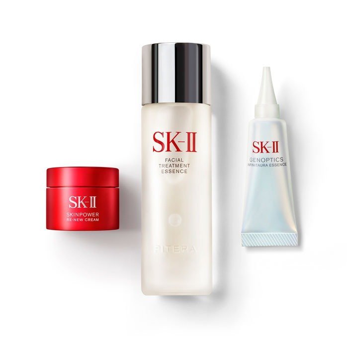 SK-II No.1化粧水「フェイシャル トリートメント エッセンス 75ml」現品を中心に、美白美容液「ジェノプティクス インフィニットオーラ エッセンス 10ml」に加えて、美容クリーム「スキンパワー リニュー クリーム 15g」が一箱に。