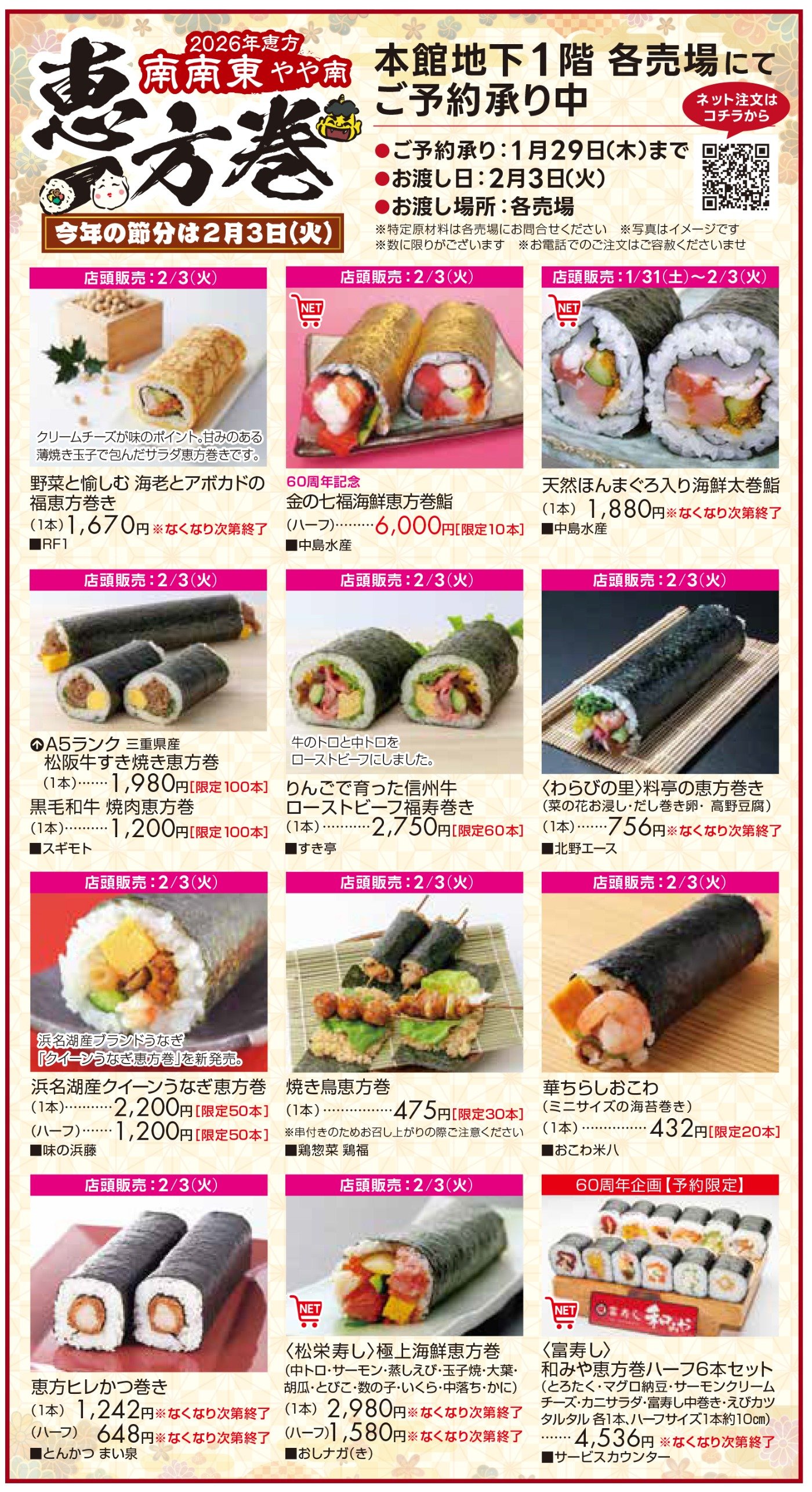 | 開催期間 | ◆承り:1月29日(木)まで ◆お渡し:2月3日(火)各売場 |