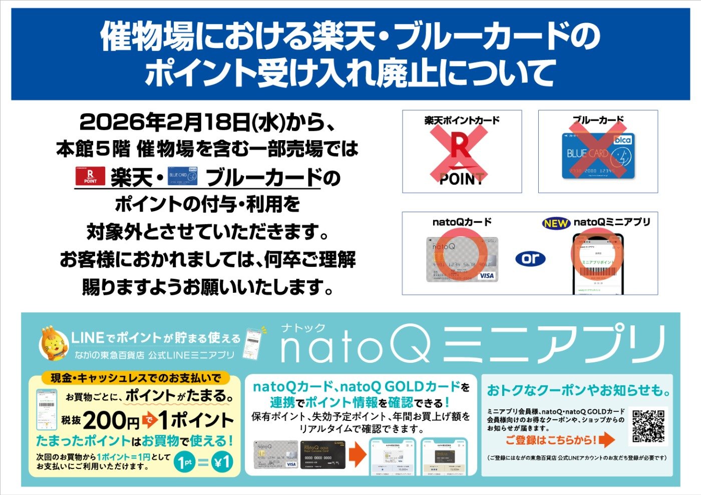 「ブルーカード」「楽天ポイント」サービス(ポイントカード提示でのポイントたまる・つかう)は、2026年2月18日(水)より、本館5階 催物場を含む一部売場で対象外とさせていただきます。