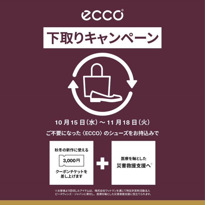 ご不要になった〈ECCO〉のシューズ、バッグをお持ち込みで、新作にも使用できる3,000円クーポンを差し上げます。