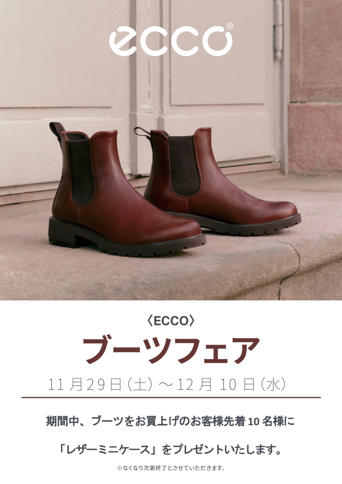 ショップからの情報に戻る 〈ECCO〉ブーツフェア 開催期間 11月29日(土)~12月10日(水) 開催場所 本館1階 エコー 冬のおしゃれを楽しんでいただくために、期間限定の「ECCOブーツフェア」を開催いたします。 スタイル性はもちろん、ECCOならではの快適な履き心地を兼ね揃えたブーツが勢ぞろい。 ぜひこの機会に、お気に入りの一足を見つけてください。 *期間中、ブーツご購入の先着10名様に「レザーミニケース」をプレゼント。 ショップからの情報に戻る