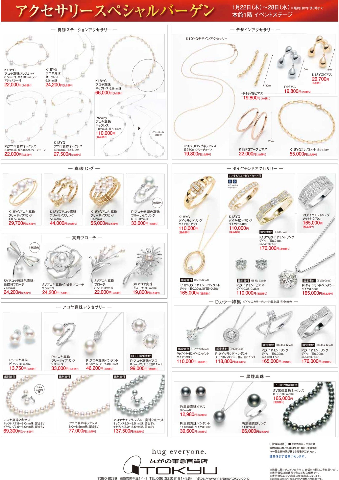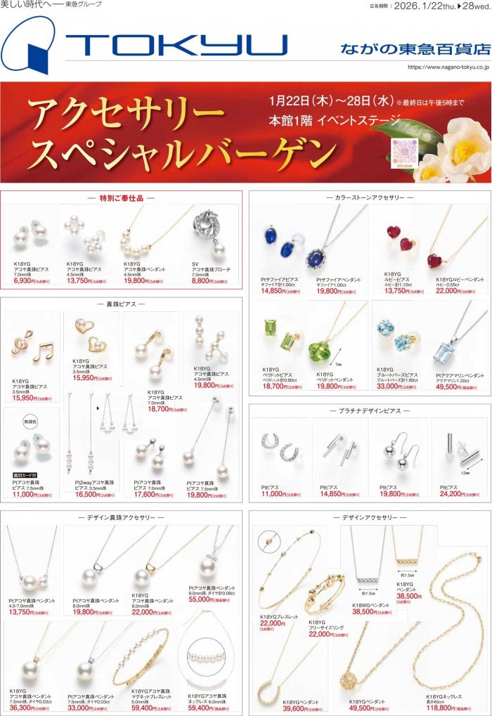 ショップからの情報に戻る アクセサリースペシャルバーゲン 開催期間 1月22日(木)~28日(水) ※最終日は午後5時まで 開催場所 本館1階 イベントステージ ピアスやペンダントのライトジュエリーからフォーマルなジュエリーまでお買い得価格で多数ご用意。 ※数に限りがございますので、売切れの際はご容赦願います。 ※表示価格は消費税を含んだ税込価格です。 ショップからの情報に戻る