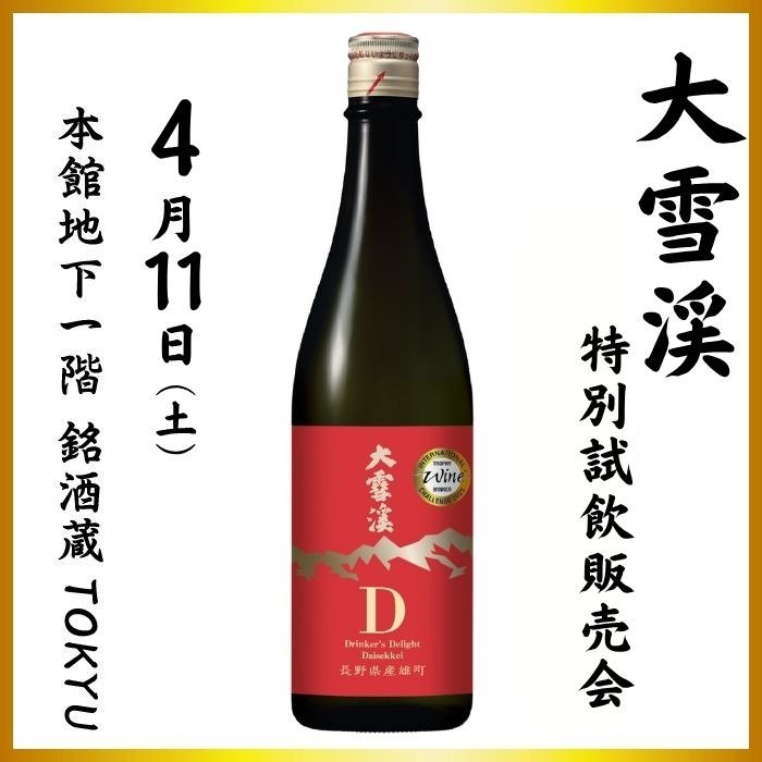 ショップからの情報に戻る 大雪渓試飲販売会 開催期間 4月11日(土) 開催場所 本館地下1階 銘酒蔵TOKYU売場 長野県で初めて「長野県産雄町」と明記される日本酒【D】数量限定品 信州・安曇野の大自然に恵まれた環境で育まれた雄町(生産者:株式会社宮澤ファーム)を使用し醸した純米吟醸酒。 長野県で初めて「長野県産雄町」と明記される日本酒で、芳醇でジューシーな香りと甘味、柑橘類のようなほろ苦さが心地よい味わいの1本に仕上がっております。 ◆純米吟醸 D 雄町(720ml)2,420円(税込) ショップからの情報に戻る