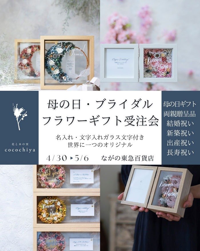 ショップからの情報に戻る 花と木の実cocochiya 期間限定販売 開催期間 4月30日(木)〜5月6日(水) ※最終日は午後5時まで 開催場所 本館1階 イベントステージ 母の日やご両親贈呈品に送る、大切な想いを彩る花の写真立て(各種)やリース・花雑貨が彩ります。 幸せを送る花の写真立て・ガラス文字入れオーダーメイド 各種11,000円~ ショップからの情報に戻る