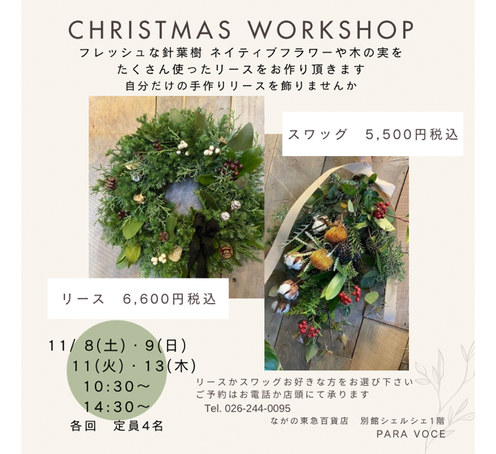 ショップからの情報に戻る PARAVOCE(パラボッセ)クリスマスワークショップ 開催期間 11月8日(土)・9(日)・11(火)・13(木) 10:30~/14:30~ 開催場所 別館シェルシェ1階 PARAVOCE(パラボッセ) フレッシュな針葉樹、ネイティブフラワーや木の実をたくさん使ったリースをお作り頂きます。 自分だけの手作りリースでクリスマスを迎えませんか。 リースかスワッグお好きな方をお選びください。 ◆クリスマスリース 6,600円(税込) ◆スワッグ 5,500円(税込) ご予約はお電話か店頭にて承ります。 ◆お問合せ:026-244-0095 ・11月8日(土)10:30~/14:30~ ・11月9(日)10:30~/14:30~ ・11月11(火)10:30~/14:30~ ・11月13(木)10:30~/14:30~ ※各回定員4名 ◆持ち物:園芸グローブ、エプロン(汚れても良い服装)、持ち帰り用の袋 ショップからの情報に戻る