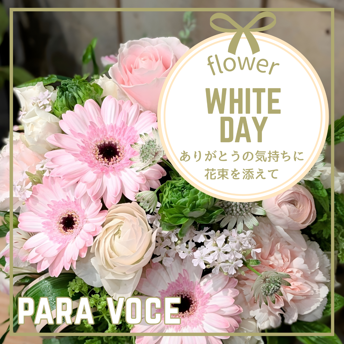 ショップからの情報に戻る ホワイトデー限定 White Day ブーケ~ありがとうを花束に~ 開催期間 3月13日(金)~14日(土) 開催場所 別館シェルシェ1階 パラボッセ 本館地下1階 上りエスカレーターサイド ホワイトデーにぴったりな春の生花ブーケで特別な一日を彩どります。 贈る人も贈られる人も笑顔になるフラワーギフトです。 ■White Day ブーケ ・1,100円(税込) ・2,200円(税込) ■White Day スタンドブーケ ・3,300円(税込) ・5,500円(税込) ※なくなり次第販売終了となります。 別館シェルシェ1階 パラボッセ <直通電話> 026-244-0095 ショップからの情報に戻る