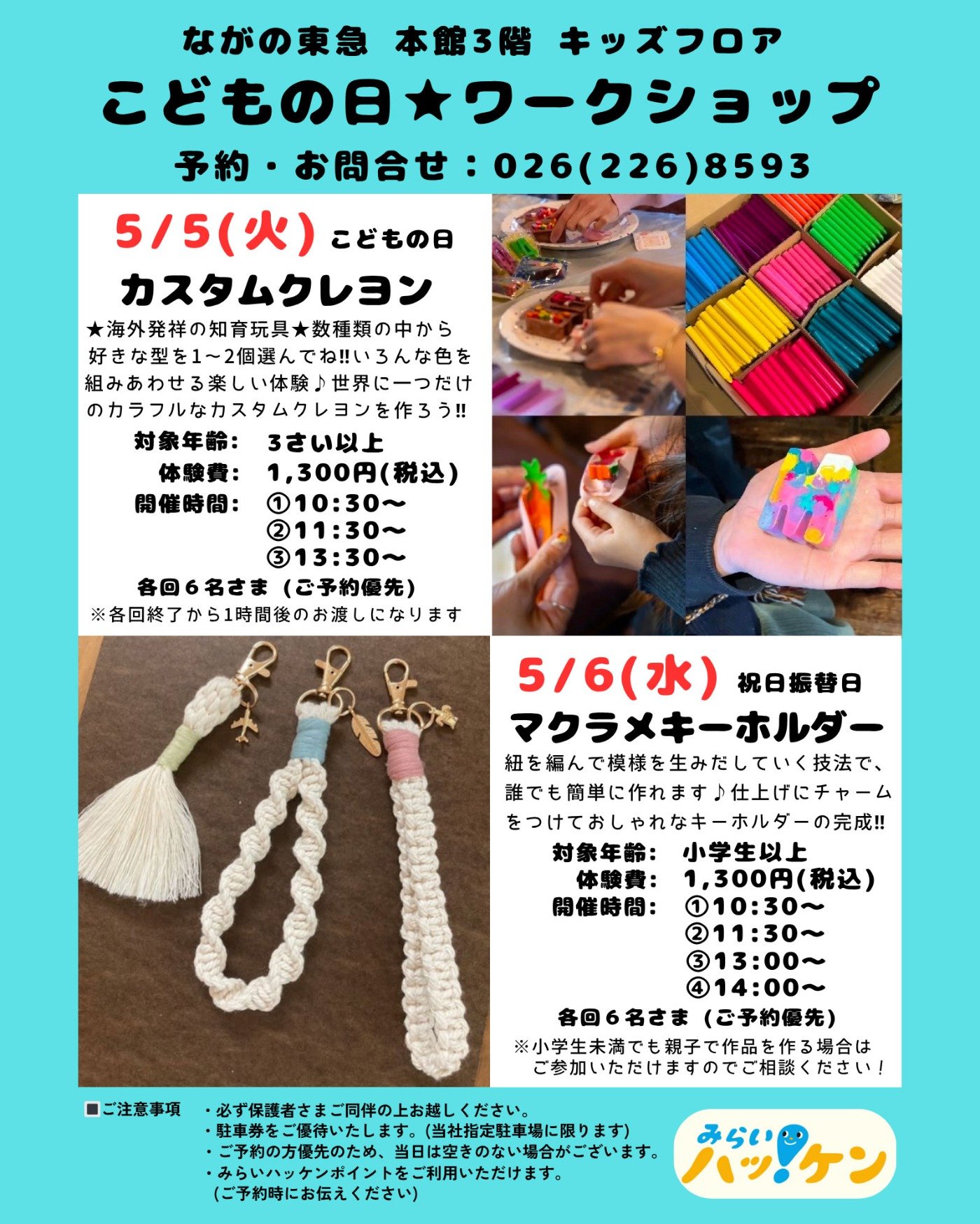 ショップからの情報に戻る こどもの日ワークショップ~みらいハッ!ケン~ 開催期間 5月5日(火)カスタムクレヨンワークショップ 5月6日(水)マクラメキーホルダーワークショップ 開催場所 本館3階 キッズフロア 楽しく体験していただける2種類のワークショップを開催いたします。 当日はそれぞれの講師の方が丁寧にレクチャーしてくれます。 長野市在住の小、中学生のお子様は、みらいハッ!ケンポイントが利用できます。 ※ご予約の方が優先となりますので、当日空きのない場合がございます。 @haru_xoxo_yu @knot_theory_mkrm ショップからの情報に戻る