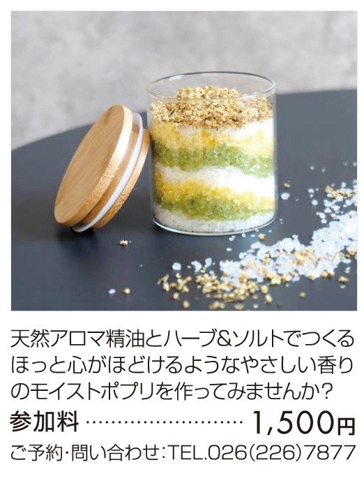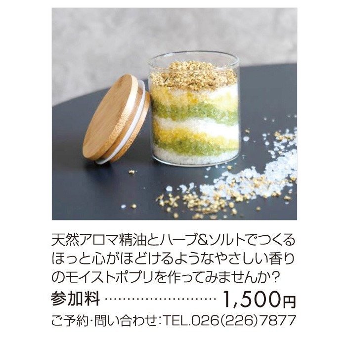 ショップからの情報に戻る モイストポプリ ワークショップ 開催期間 5月9日(土)・10日(日) 開催時間 ①午前11時から ②午後1時から 所要時間1時間程度(各回定員6名) 開催場所 本館3階 生活の木 ショップからの情報に戻る