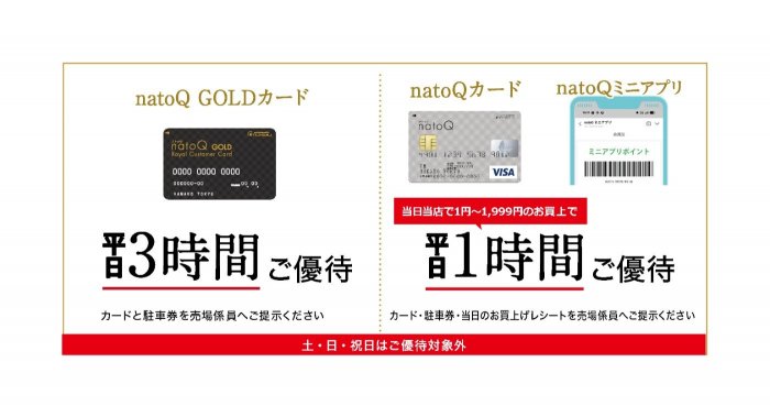 natoQ、natoQ GOLD、natoQミニアプリ会員様限定 平日限定 駐車料金ご優待