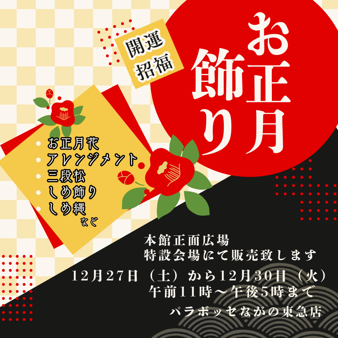 ショップからの情報に戻る 〈パラボッセ〉開運 お正月飾り販売会 開催期間 12月27日(土)~30日(火) 開催時間 11:00~17:00 開催場所 本館正面広場 特設会場 松、千両、金柳、ハボタンなどセットになった花束やお正月にそのまま置いて飾れるアレジメントフラワー、玄関に飾るお正月飾り、しめ縄などをご用意しております。 ◆お正月 花束 3,300円~ そのまま置いて飾れる ◆お正月 アレンジメントフラワー 3,850円~ ◆しめ縄 880円~ ショップからの情報に戻る