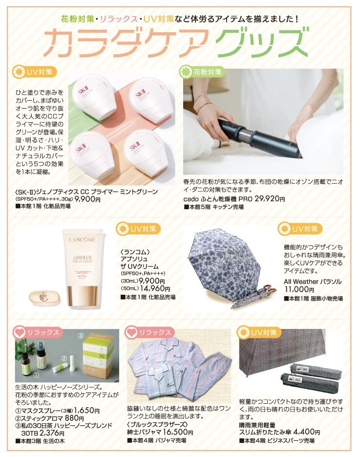 ショップからの情報に戻る カラダケアグッズ 開催場所 本館1階 化粧品売場/服飾小物売場 本館3階 生活の木 本館4階 パジャマ売場/ビジネスパーツ売場 本館5階 キッチン売場 ショップからの情報に戻る